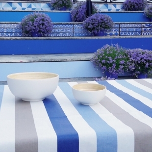 The Stripes blue/taupe coated tablecloth is available in round or oval