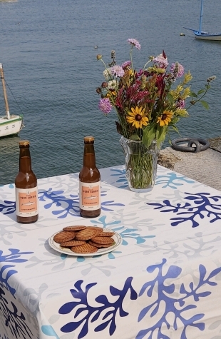 Wipe clean your Coral bleu with a damp cloth after each meal. You can also use Vinegar or bleach to remove stubborn stains. Machine washable is allowed occasionally at 30°C without any conditioner and no spin. Ironing is mandatory on the backside (cotton side) or on the right side with a press cloth or a damp tea towel.