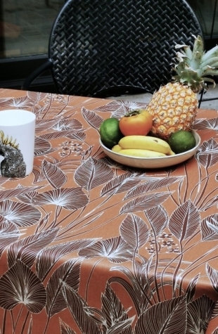 Principalement utilisées en intérieur, les nappes enduites, imperméables et déperlantes, sont également adaptées pour les tables de jardin. Vous trouverez parmi nos motifs (nappe tropicale, nappe enduite fleurie, nappe champêtre…), celui qui égaiera votre extérieur. Nous proposons en option de faire la nappe avec le trou du parasol. Le coton enduit est parfait pour une nappe d’extérieur, nous vous invitons à consulter notre page nappes de jardins.