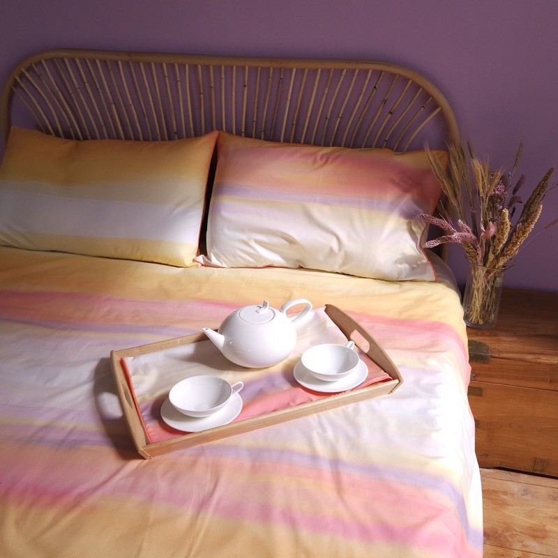 Het Fleur de Soleil dekbedovertrek is gemaakt van perkalkatoen geweven in de Vogezen in Frankrijk. Het weefsel van 80 draden/cm² geeft het een ongeëvenaarde zachtheid.